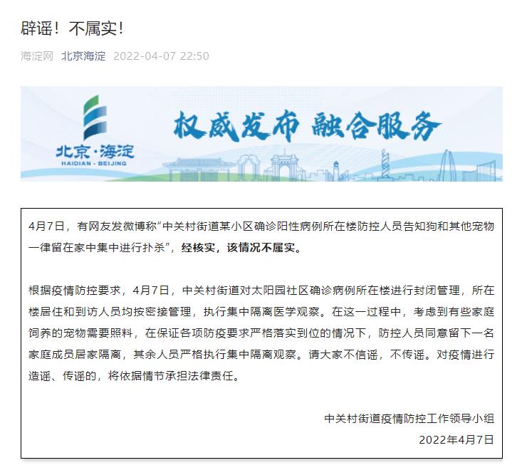 中新網4月8日電 據北京市海淀區融媒體中心官方微信消息,中關村街道疫情防控工作領導小組發布辟謠指出,4月7日,有網友發微博稱“中關村街道某小區確診陽性病例所在樓防控人員告知狗和其他寵物一律留在家中集中進行撲殺”,經核實,該情況不屬實。