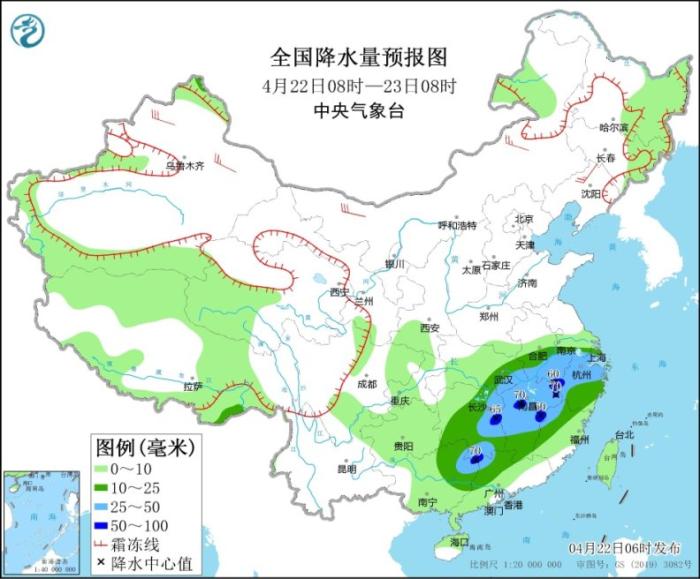 4月22日08時至23日08時,新疆北疆北部、青海南部、西藏北部等地部分地區有小到中雪或雨夾雪,局地有大到暴雪。江淮南部、江漢東部、江南大部、華南北部等地部分地區有中到大雨,其中,安徽南部、湖南東部、江西中北部、浙江西部、廣西東北部等地局地有暴雨(50~70毫米)。新疆北部、內蒙古、東北南部等地部分地區有4~6級風(見圖1)。