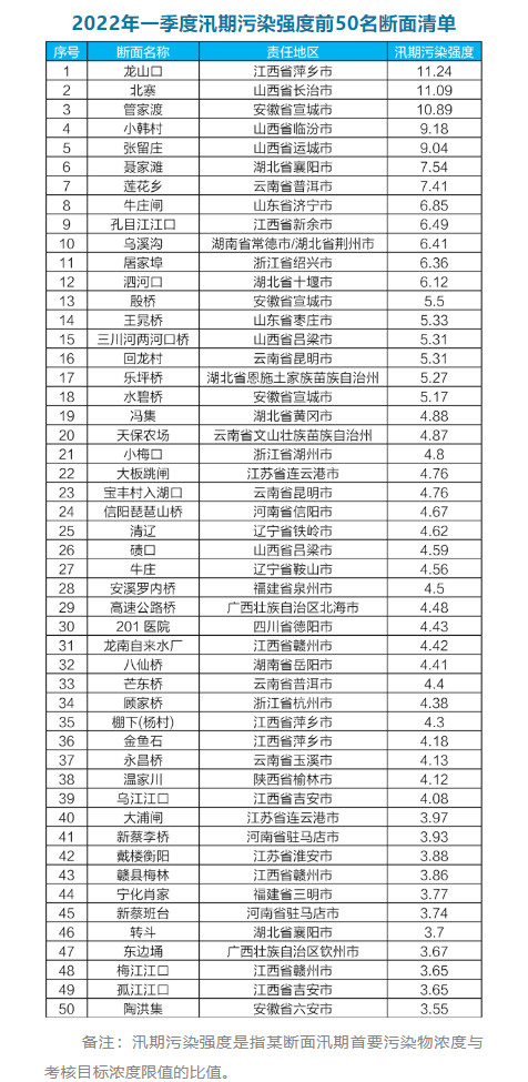 扣除自然因素影響,全國25個(gè)劣Ⅴ類斷面分布在12個(gè)省份。其中,云南省數(shù)量最多,為7個(gè)。22個(gè)水質(zhì)明顯惡化斷面分布在13個(gè)省份。其中,安徽省數(shù)量最多,為4個(gè)。全國汛期污染強(qiáng)度較大的前50個(gè)斷面分布在15個(gè)省份,江西、湖北、云南省數(shù)量較多,占比為42.0%。其中,江西省萍鄉(xiāng)市龍山口斷面、山西省長治市北寨斷面、安徽省宣城市管家渡斷面汛期污染強(qiáng)度位于全國前三名。