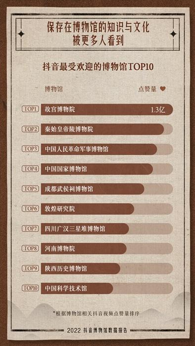 報告顯示,根據相關視頻點贊量排序,故宮博物院、秦始皇帝陵博物院、中國人民革命軍事博物館、中國國家博物館、成都武侯祠博物館等入選抖音最受歡迎十大博物館。其中,故宮博物院相關視頻被抖音網友點贊超過1.3億次。