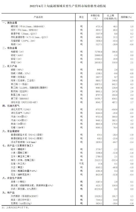 2022年6月上旬流通領域重要生產資料市場價格變動情況。國家統計局網站截圖