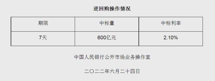 中新財經6月24日電 央行網站消息,為維護銀行體系流動性合理充裕,2022年6月24日人民銀行以利率招標方式開展了600億元逆回購操作,期限為7天,中標利率2.10%。(完)
