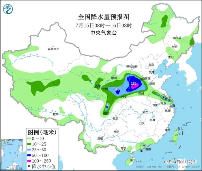 預(yù)計(jì),7月14日08時(shí)至15日08時(shí),西北地區(qū)東部、江蘇北部、安徽北部等地部分地區(qū)有大到暴雨,其中,甘肅東部、陜西北部等地局地有大暴雨(100~120毫米)。上述部分地區(qū)伴有短時(shí)強(qiáng)降水(最大小時(shí)降雨量20~50毫米,局地可超過60毫米),局地有雷暴大風(fēng)等強(qiáng)對(duì)流天氣。中央氣象臺(tái)7月14日06時(shí)發(fā)布暴雨藍(lán)色預(yù)警。