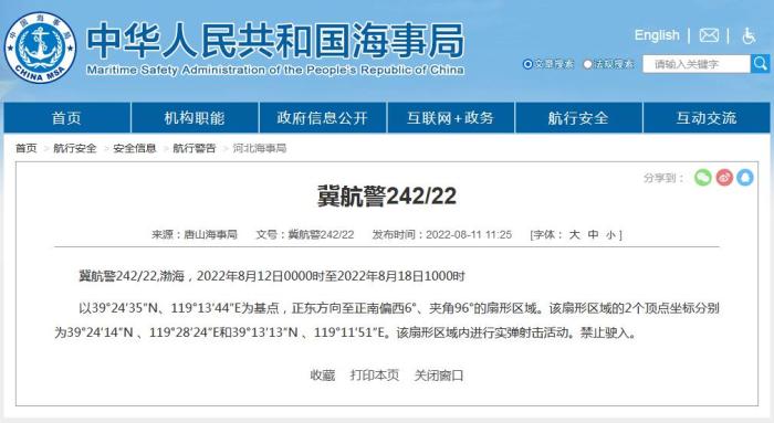 中新網8月12日電 據中國海事局網站消息,唐山海事局發布航行警告,8月12日0時至8月18日10時,渤海以39°24′35″N、119°13′44″E為基點,正東方向至正南偏西6°、夾角96°的扇形區域(該扇形區域的2個頂點坐標分別為39°24′14″N 、119°28′24″E和39°13′13″N 、119°11′51″E)內進行實彈射擊活動,禁止駛入。
