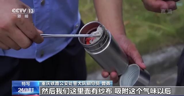 重慶鐵路公安處警犬隊馴導(dǎo)員 曾勇:這是我們訓(xùn)練用的乳化炸藥,然后我們這里面有紗布,吸附這個氣味后,就可以放在箱子里面,然后讓搜爆犬來進行搜尋。如果它坐下或者臥下示警的話,就表示這個箱子里有危險品。