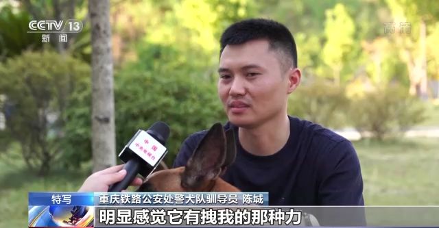 重慶鐵路公安處警犬隊馴導(dǎo)員 陳城:有一次我們出去找一個人的時候,在山林里搜救,我在行進的途中不小心差點摔下去了,因為拽著(閃電的)警繩,明顯感覺它有拽我的那種力,把我拖上去的感覺挺感動的,當(dāng)時內(nèi)心有一顫。
