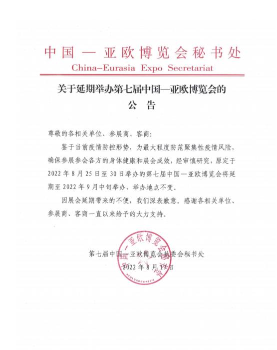 8月17日晚,第七屆中國—亞歐博覽會官網發布公告,宣布原定于8月25日在烏魯木齊舉辦的第七屆中國—亞歐博覽會將延期至9月中旬舉辦。通知內容如下: