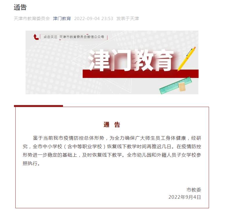 中新網9月5日電 天津市教育委員會4日晚在其官方微信發布通告稱,鑒于當前天津市疫情防控總體形勢,為全力確保廣大師生員工身體健康,經研究,全市中小學校(含中等職業學校)恢復線下教學時間再推遲幾日。在疫情防控形勢進一步穩定的基礎上,及時恢復線下教學。全市幼兒園和外籍人員子女學校參照執行。