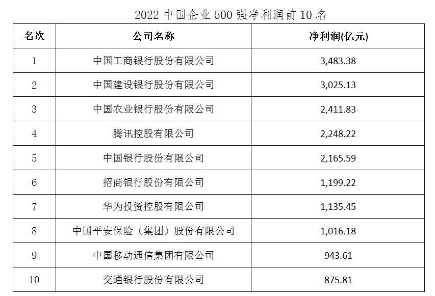 凈利潤前10名為工商銀行、建設銀行、農(nóng)業(yè)銀行、騰訊、中國銀行、招商銀行、華為、中國平安、中國移動、交通銀行。