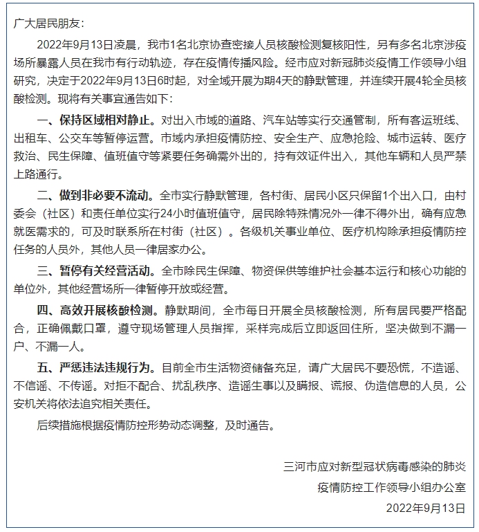 河北省三河市應(yīng)對(duì)新型冠狀病毒感染的肺炎疫情防控工作領(lǐng)導(dǎo)小組辦公室9月13日發(fā)布通告,決定于2022年9月13日6時(shí)起,對(duì)全域開展為期4天的靜默管理,并連續(xù)開展4輪全員核酸檢測。通告全文如下: