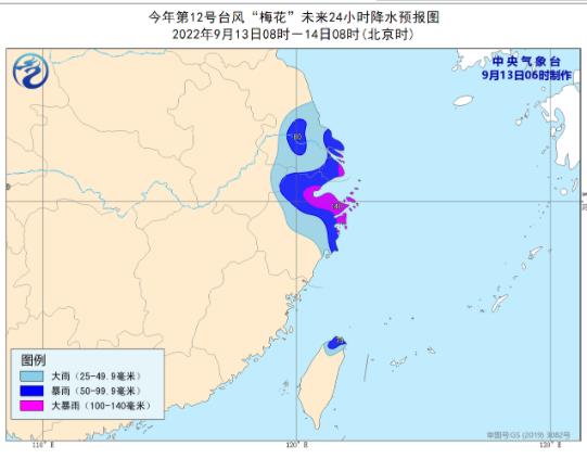 降水預報:9月13日8時至14日8時,臺灣島北部、浙江北部、上海、江蘇東南部等地將有大到暴雨,其中浙江東北部和上海等地的部分地區有大暴雨(100-140毫米)。