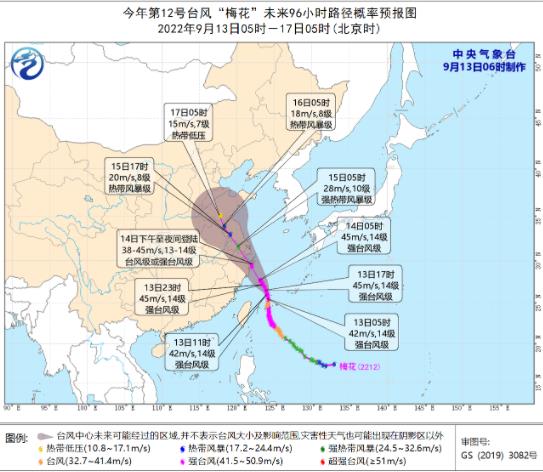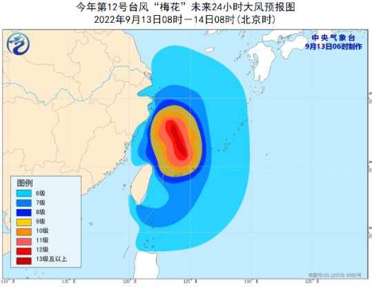 大風預報:9月13日8時至14日8時,巴士海峽、臺灣海峽北部、臺灣以東洋面、黃海西南部海域、東海大部及釣魚島附近海域、長江口區、杭州灣以及臺灣島北部和東部沿海、浙江沿海、福建北部沿海、上海沿海、江蘇東南部沿海將有6-8級大風,陣風9-11級,其中東海部分海域將有9-11級大風,陣風12-14級,“梅花”中心經過的附近海面的風力有12-14級,陣風可達15-16級。