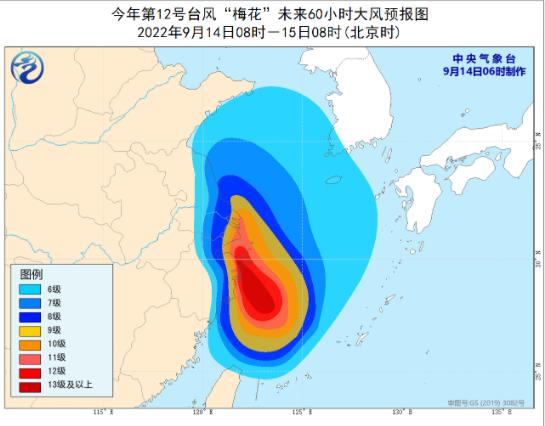 大風預報:9月14日08時至15日08時,東海大部及釣魚島附近海域、黃海中南部海域、長江口區、杭州灣以及臺灣島北部沿海、福建北部沿海、山東南部沿海、浙江東部、上海、江蘇東部沿海和地區將有6-8級大風,陣風9-11級,其中東海中西部海域、浙江中北部沿海、上海沿海、江蘇東南部沿海、杭州灣、長江口區將有9-11級大風,陣風12-14級,“梅花”中心經過的附近海面或地區的風力有12-14級,陣風可達15-16級。