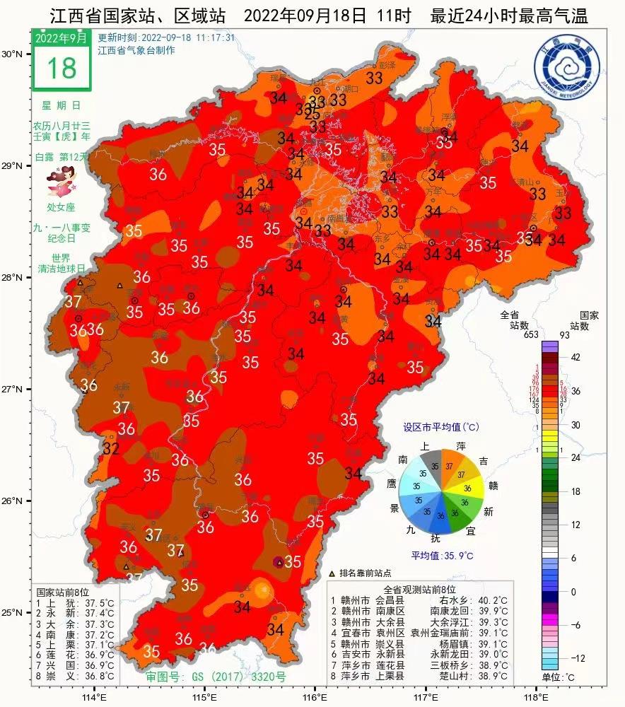 記者從江西省氣象臺和省突發事件預警信息發布中心獲悉,9月18日江西省有1159個氣象監測站最高氣溫超35℃,90個氣象監測站最高氣溫超38℃,覆蓋全省11個地市。