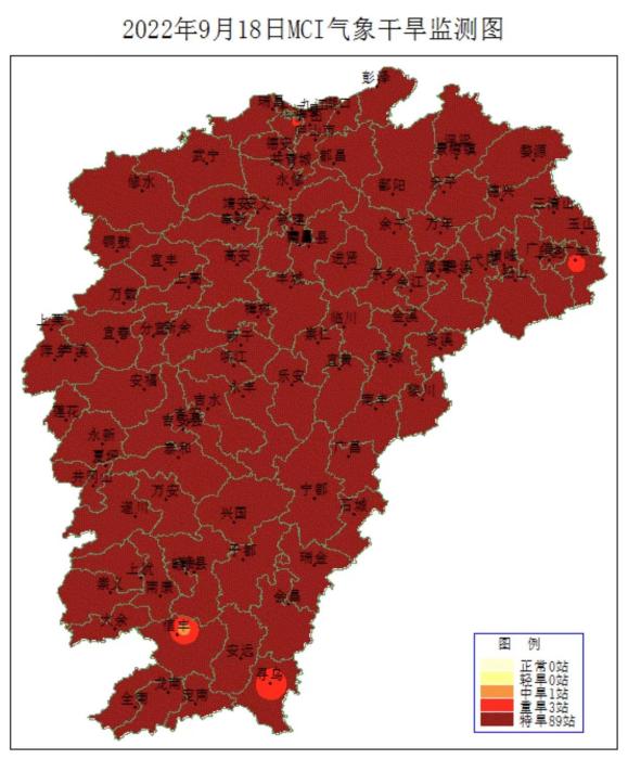 今天(19日),江西高溫持續,由于無有效降雨,全省95.7%的縣(市、區)出現特重氣象干旱。7月12日江西局部開始出現重度氣象干旱以來至今已持續69天,森林火險氣象等級4(高)至5級(極高)。