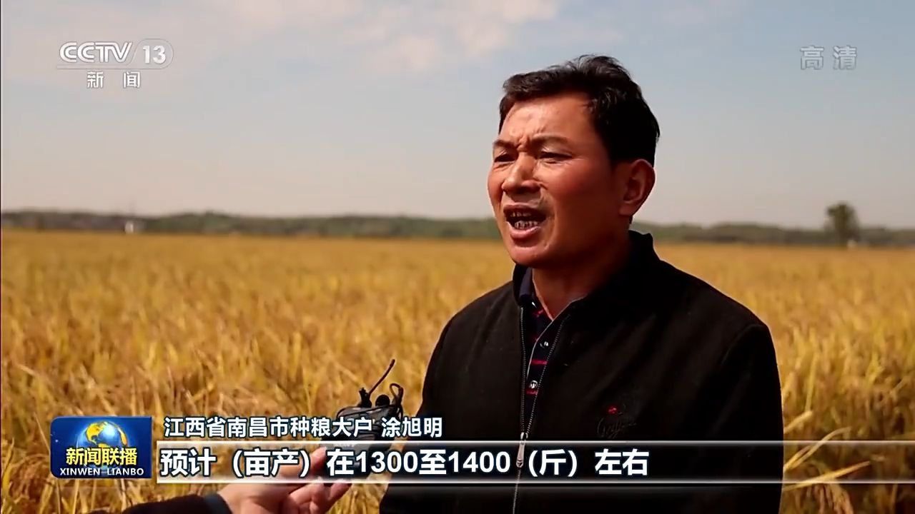 江西省南昌市種糧大戶 涂旭明:中稻長得非常好,預(yù)計(jì)(畝產(chǎn))在1300至1400(斤)左右,比去年大概增產(chǎn)了100斤以上。