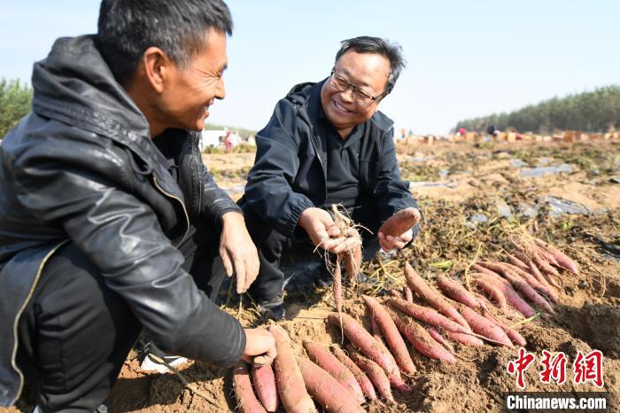 如今,新鮮采挖的甘薯一排排擺在地頭,顏色鮮艷、個(gè)大飽滿。“畝產(chǎn)6千斤以上,不同品種收購價(jià)格不同,鮮食型紅薯在地頭就能賣到每斤1.5元到1.7元,往常果腹的小甘薯成了農(nóng)民致富的‘金坨坨’。”高清喜說。