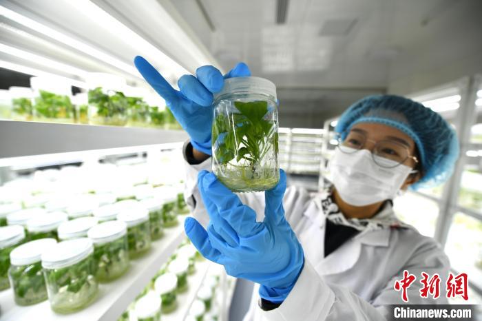 在河北中薯農(nóng)業(yè)科技集團(tuán)股份有限公司甘薯脫毒組培中心,技術(shù)員查看脫毒苗生長情況。 鄭晨子 攝