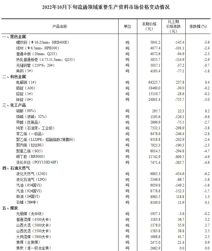 中新網11月4日電 國家統計局網站4日公布2022年10月下旬流通領域重要生產資料市場價格變動情況。據對全國流通領域9大類50種重要生產資料市場價格的監測顯示,2022年10月下旬與10月中旬相比,15種產品價格上漲,32種下降,3種持平。其中,生豬(外三元)價格環比下跌0.7元,跌幅2.5%。(中新財經)