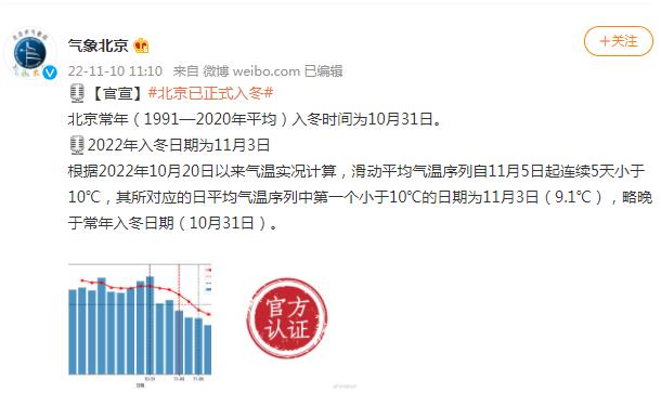 中新網11月10日電 據北京市氣象局官方微博消息,北京常年(1991—2020年平均)入冬時間為10月31日,2022年入冬日期為11月3日。