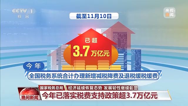 國家稅務總局今天公布最新數據,截至11月10日,今年全國稅務系統合計辦理新增減稅降費及退稅緩稅緩費已超3.7萬億元,各項稅費支持政策有效減輕了企業負擔,增強了企業發展動能。