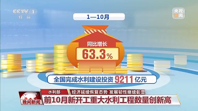 1—10月,全國完成水利建設投資9211億元,同比增長63.3%;較9月底增加投資975億元。