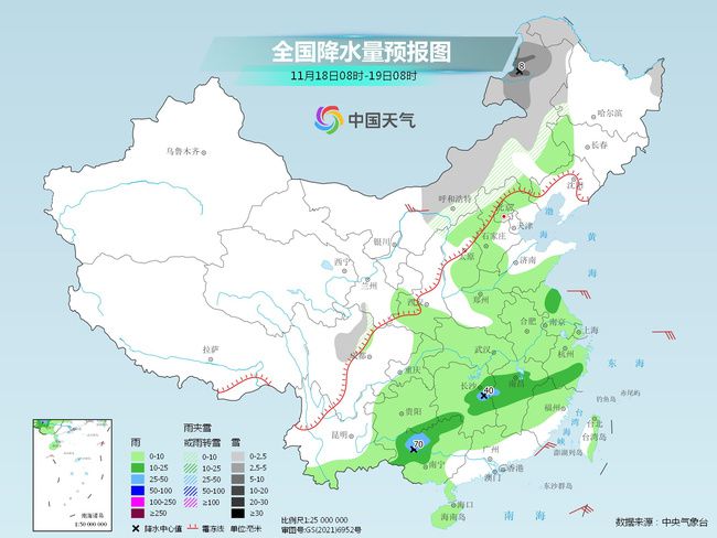中國天氣網訊 昨天(11月17日)開始,新一股冷空氣自新疆開始自西向東逐漸影響我國其它地區,今明兩天,長江以北地區將陸續迎來明顯降溫,華北、東北等地還會有雨雪天氣現身,局地降水猛烈。而在南方,今明兩天,雨水也將繼續營業,20日短暫“調休”一天,21日至22日,新一輪降雨又將上線,幾乎無縫銜接。