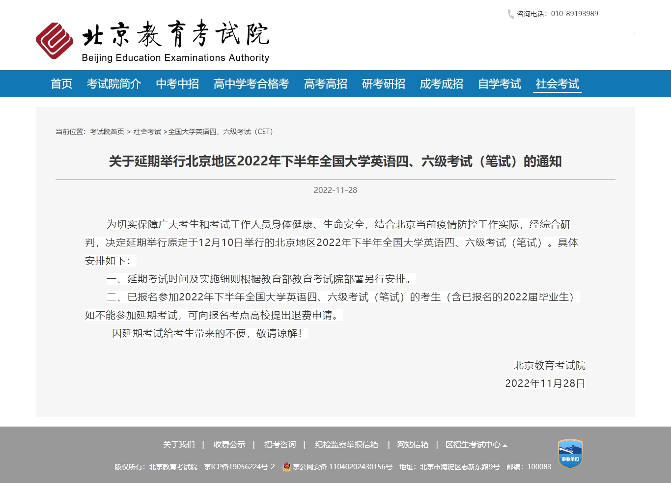 中新網(wǎng)11月28日電 據(jù)北京市教育考試院網(wǎng)站消息,北京教育考試院28日發(fā)布通知,為切實(shí)保障廣大考生和考試工作人員身體健康、生命安全,結(jié)合北京當(dāng)前疫情防控工作實(shí)際,經(jīng)綜合研判,決定延期舉行原定于12月10日舉行的北京地區(qū)2022年下半年全國大學(xué)英語四、六級考試(筆試)。具體安排如下: