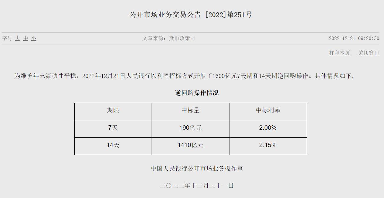 中新網(wǎng)12月21日電 據(jù)央行官網(wǎng)消息,為維護(hù)年末流動性平穩(wěn),2022年12月21日人民銀行以利率招標(biāo)方式開展了1600億元7天期和14天期逆回購操作。中標(biāo)利率分別為2.00%和2.15%。(中新財經(jīng))