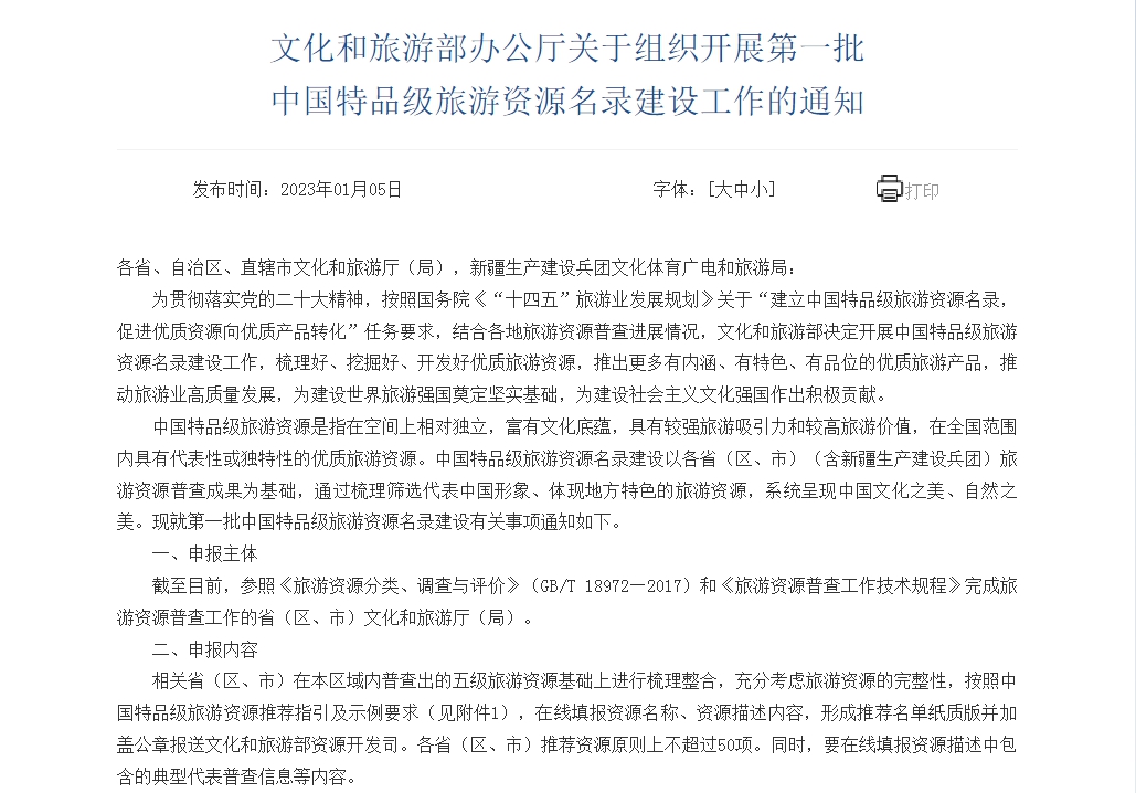 文旅部:開展第一批中國特品級旅游資源名錄建設(shè)工作