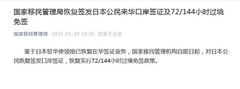 中新網1月29日電 據國家移民管理局微信公眾號消息,鑒于日本駐華使領館已恢復在華簽證業務,國家移民管理機構自即日起,對日本公民恢復簽發口岸簽證,恢復實行72/144小時過境免簽政策。