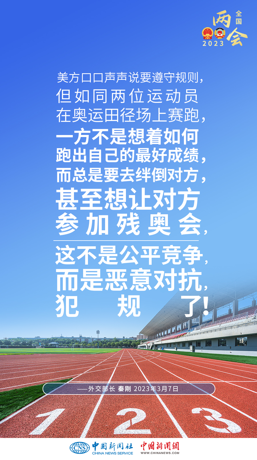 秦剛:美方聲稱要“競贏”中國但不尋求沖突。但實際上,美方的所謂“競爭”,就是全方位遏制打壓,就是你死我活的零和博弈。美方口口聲聲說要遵守規則,但如同兩位運動員在奧運田徑場上賽跑,一方不是想著如何跑出自己的最好成績,而總是要去絆倒對方,甚至想讓對方參加殘奧會,這不是公平競爭,而是惡意對抗,犯規了!美方所謂要給中美關系“加裝護欄”“不沖突”,實際上就是要中國打不還手,罵不還口,但這辦不到!