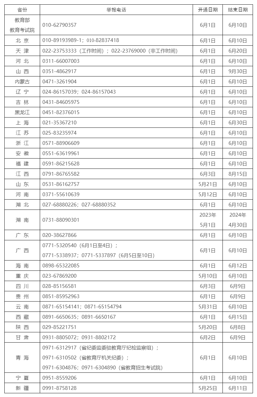教育部和各省(區(qū)、市)開(kāi)通2023年高考舉報(bào)電話