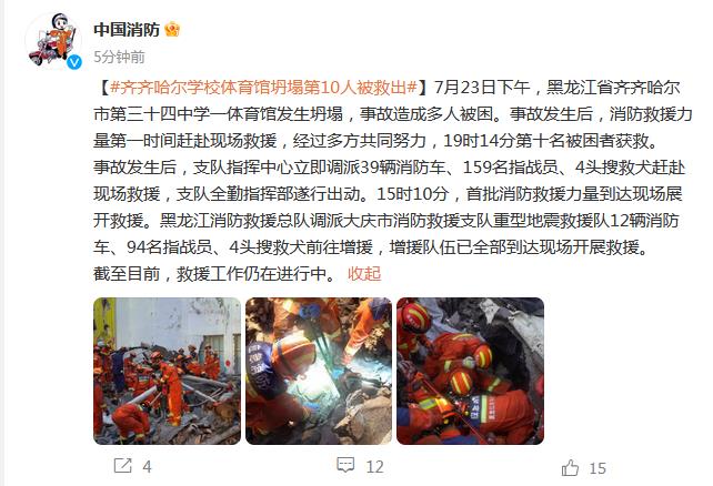中新網7月23日電 據中國消防官微消息,7月23日下午,黑龍江省齊齊哈爾市第三十四中學一體育館發生坍塌,事故造成多人被困。事故發生后,消防救援力量第一時間趕赴現場救援,經過多方共同努力,19時14分第十名被困者獲救。