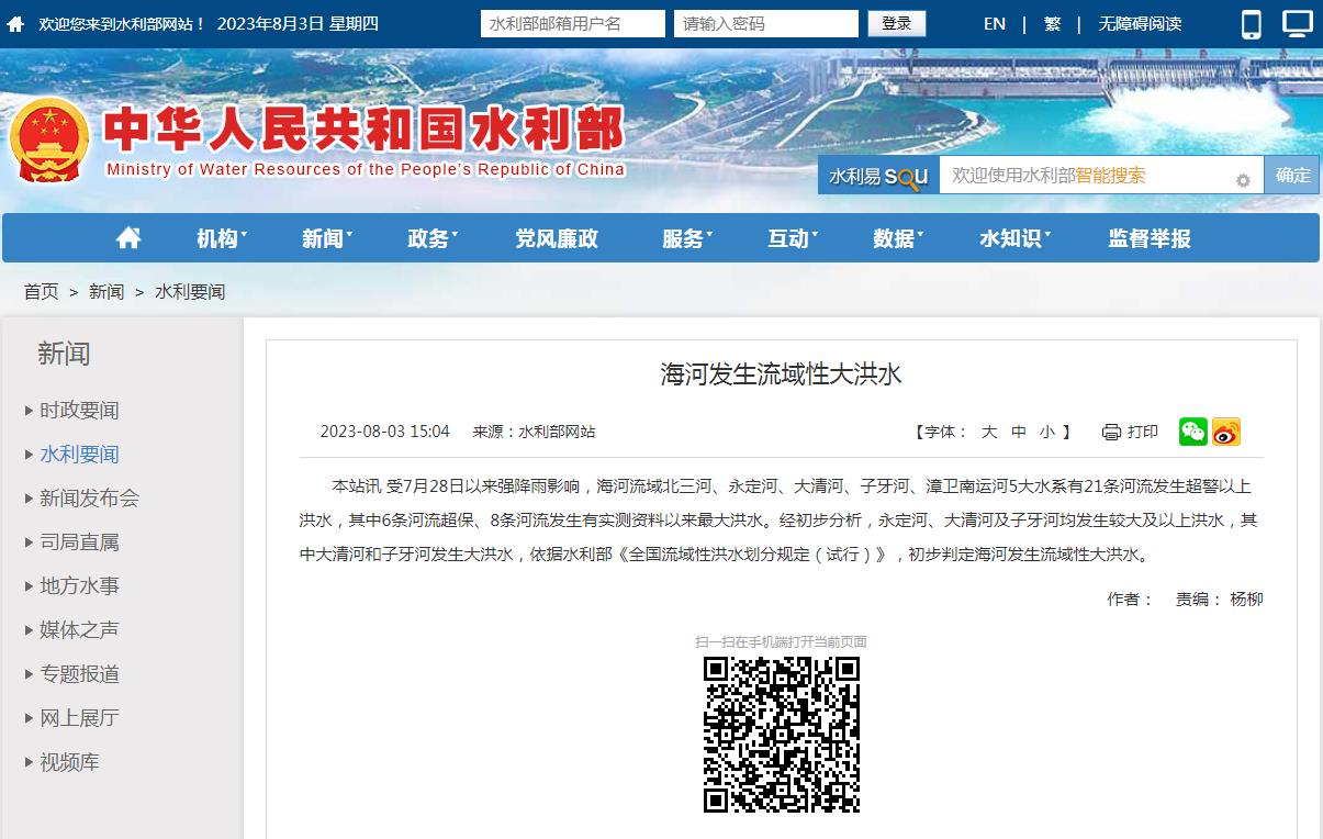 水利部:初步判定海河發生流域性大洪水