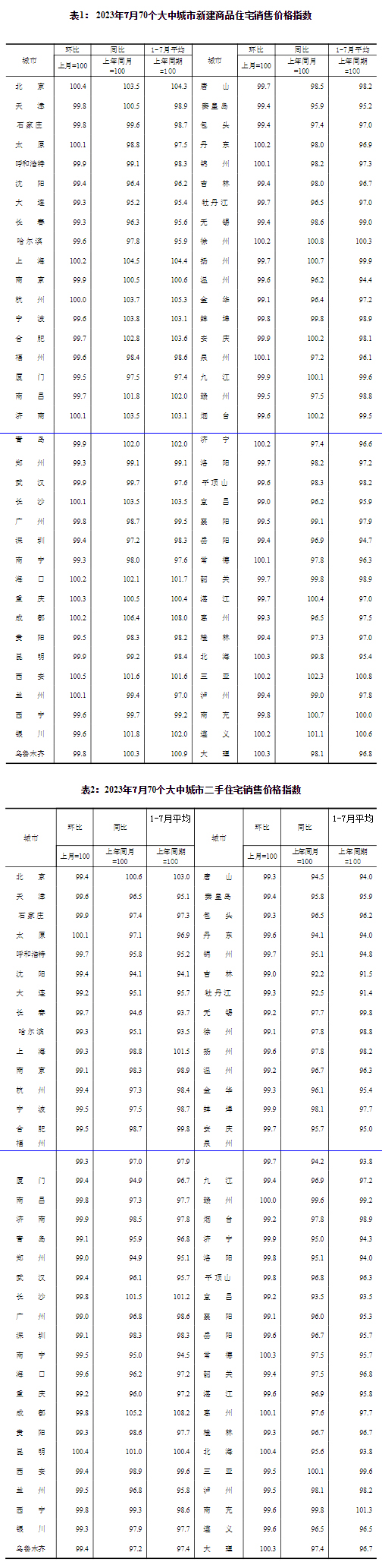 從新建商品住宅看,7月份,一線城市新建商品住宅銷售價格環比連續兩月持平,其中北京和上海環比分別上漲0.4%和0.2%,廣州和深圳環比分別下降0.2%和0.6%;二線城市新建商品住宅銷售價格環比由上月持平轉為下降0.2%;三線城市新建商品住宅銷售價格環比下降0.3%,降幅比上月擴大0.2個百分點。從二手住宅看,7月份,一線城市二手住宅銷售價格環比下降0.8%,降幅比上月擴大0.1個百分點;二線城市二手住宅銷售價格環比下降0.5%,降幅比上月擴大0.1個百分點;三線城市二手住宅銷售價格環比下降0.4%,降幅與上月相同。
