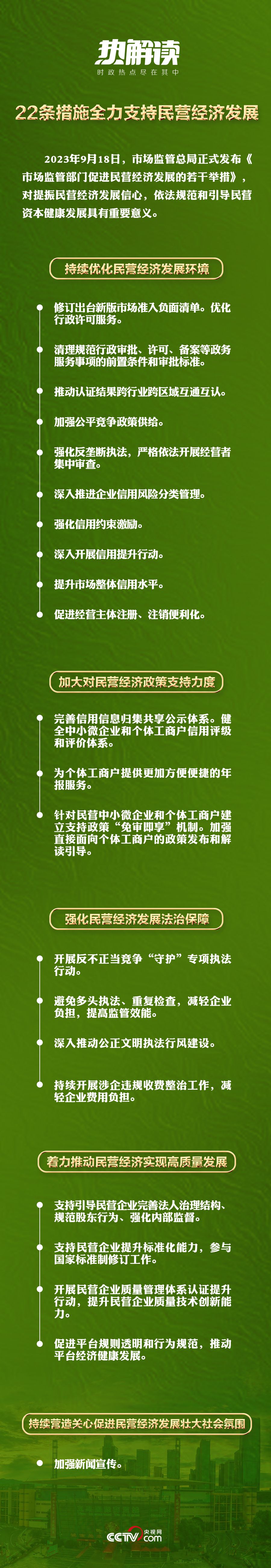 2023年7月14日,中共中央國務院出臺《關(guān)于促進民營經(jīng)濟發(fā)展壯大的意見》,對促進民營經(jīng)濟發(fā)展壯大作出新的重大部署。2023年9月18日,市場監(jiān)管總局發(fā)布《市場監(jiān)管部門促進民營經(jīng)濟發(fā)展的若干舉措》,通過22條措施為全力支持民營經(jīng)濟發(fā)展設計了具體落實的“施工圖”。
