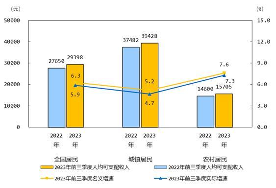 前三季度,全國居民人均可支配收入29398元,比上年同期名義增長6.3%,扣除價格因素,實際增長5.9%。分城鄉看,城鎮居民人均可支配收入39428元,增長(以下如無特別說明,均為同比名義增長)5.2%,扣除價格因素,實際增長4.7%;農村居民人均可支配收入15705元,增長7.6%,扣除價格因素,實際增長7.3%。
