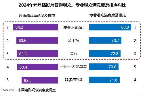 中國電影觀眾滿意度調(diào)查 2024年元旦檔調(diào)查結(jié)果顯示,元旦檔電影觀眾滿意度得分83.0分,環(huán)比增長0.2分。檔期以多元化且高契合度的影片供給陪伴觀眾跨年,得到了較高的滿意度評價,5部影片中有4部進(jìn)入歷史調(diào)查19部元旦檔影片的滿意度前十,喜劇《年會不能停!》以84.2分領(lǐng)銜,《金手指》83.0分居第二位,《潛行》《一閃一閃亮星星》均超82分,《非誠勿擾3》超81分。