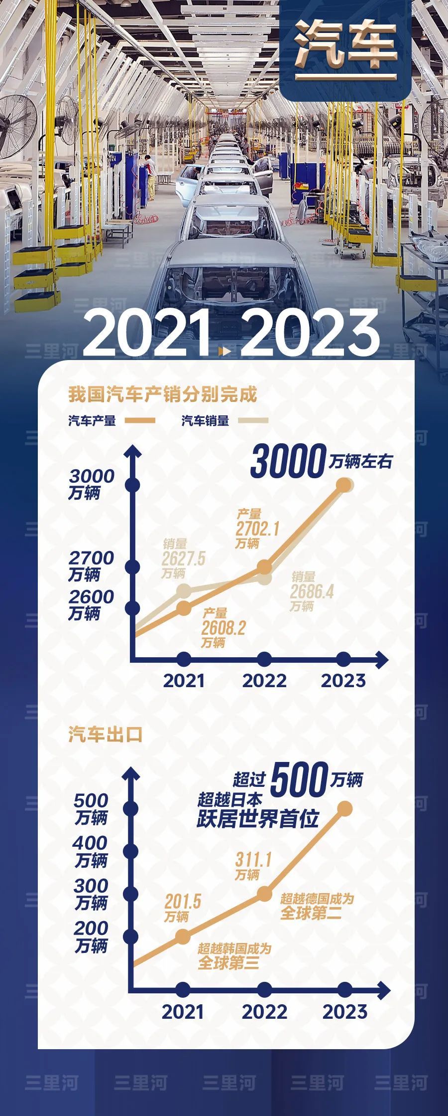 2023年,全年汽車產(chǎn)銷量預(yù)計達3000萬輛左右、創(chuàng)歷史新高,出口超過500萬輛,超越日本,躍居世界首位。