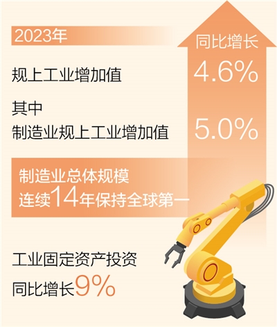 本報北京1月21日電 (記者王政、劉溫馨)記者日前從工業(yè)和信息化部獲悉:2023年,全年規(guī)模以上工業(yè)增加值同比增長4.6%,較2022年提升1個百分點(diǎn),其中制造業(yè)規(guī)模以上工業(yè)增加值同比增長5.0%,我國制造業(yè)總體規(guī)模連續(xù)14年保持全球第一。