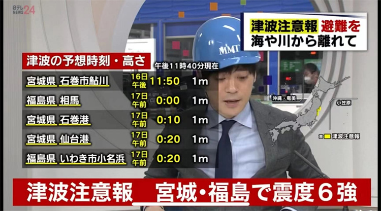3月16日日本福島縣海域發生7.4級地震,當地發出海嘯警報。圖片來源:日本新聞報道截圖