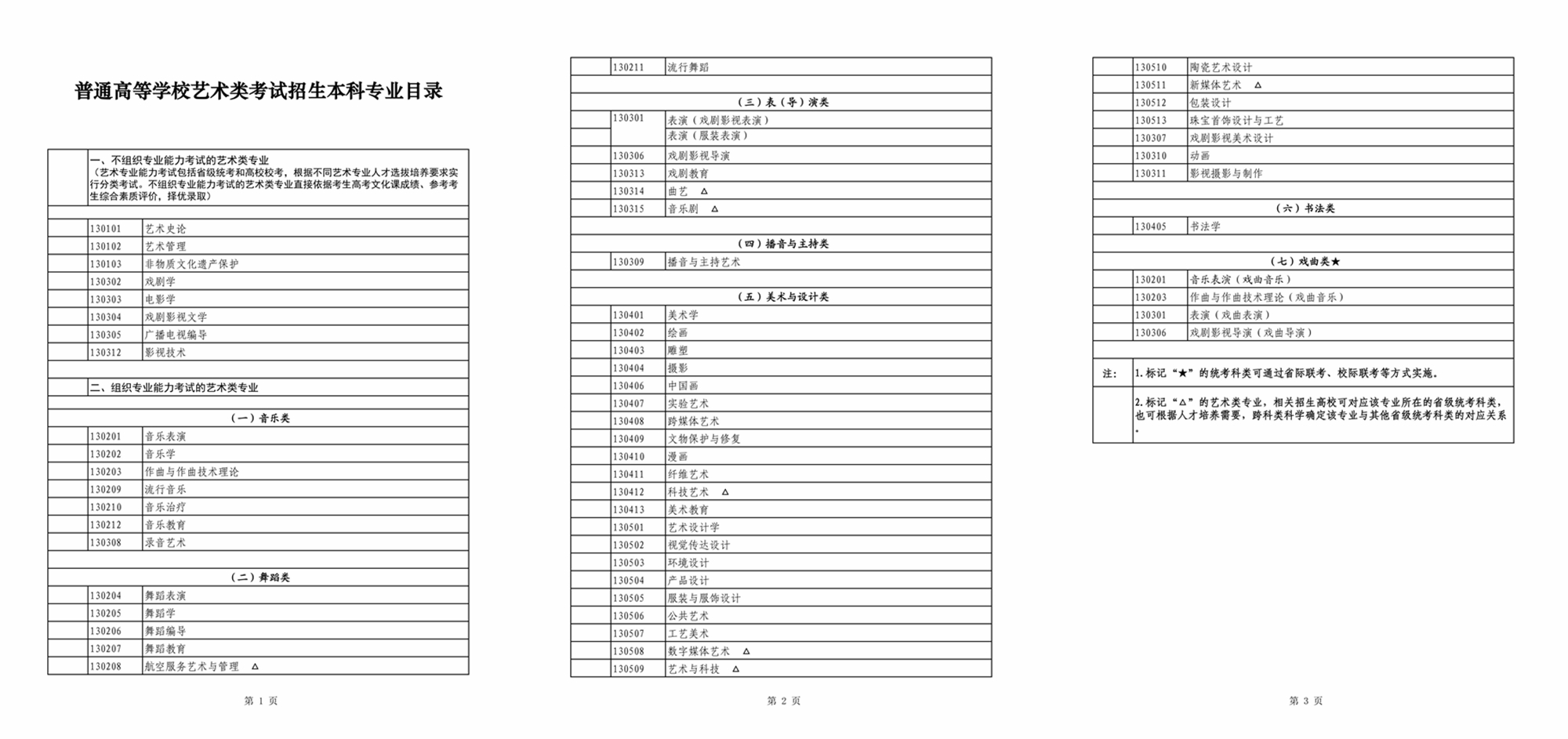 從目前來看,各地藝術類專業省級統考設音樂類、舞蹈類、表(導)演類、播音與主持類、美術與設計類、書法類等6個科類。各地均出臺文件,對各科類考試科目、分值、內容、形式、要求和考試組織實施各環節等作出具體規定。