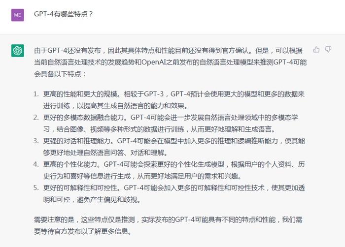 有意思的是,在GPT-4發布后,再去問ChatGPT和GPT-4“什么是GPT-4”,ChatGPT回答:GPT-4是OpenAI公司計劃開發的下一代自然語言處理模型,由于GPT-4還沒有發布,因此其具體特點和性能目前還沒有得到官方確認。