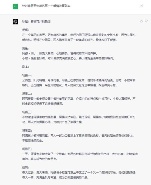 目前GPT-4僅限于ChatGPT Plus訂戶使用。記者體驗時發現,GPT-4生成速度比較慢,但回答簡明扼要,更有創造性,無論是寫詩歌還是故事劇本都不在話下。例如它可以根據“春天萬物復蘇”賦詩一首或者寫成一個愛情故事的劇本。