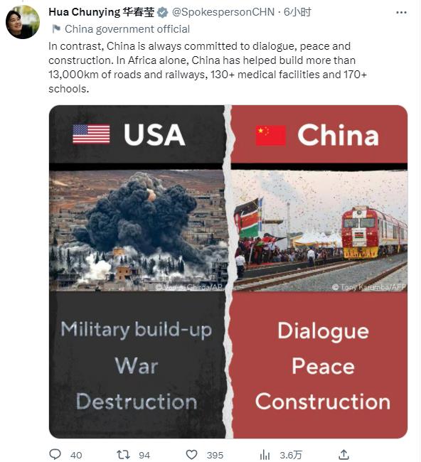 華春瑩接著在第二條推文中發(fā)了一張中美對比圖,圖中顯示美國沉迷于軍事建設(shè)、戰(zhàn)爭和破壞。“相比之下,中國始終堅持對話、和平、建設(shè)。僅在非洲,中國就援建了1.3萬多公里公路和鐵路、130多個醫(yī)療設(shè)施、170多所學(xué)校。”華春瑩說。