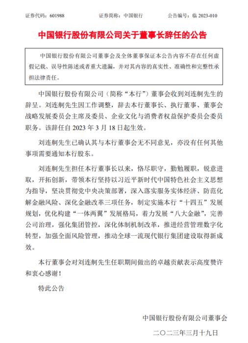另外,19日,中國銀行公告稱,劉連舸因工作調整,辭去董事長、執行董事、董事會戰略發展委員會主席及委員、企業文化與消費者權益保護委員會委員職務。