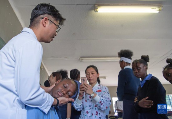 4月3日,在納米比亞溫得和克的伊曼紐爾·謝菲迪中學課堂上,一名學生體驗艾灸。新華社發(fā)(穆薩·卡薩克攝)