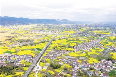 陜西省漢中市南鄭區岳家嶺村,一列動車組列車在金燦燦的油菜花海中穿行。