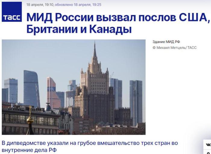 據報道,俄外交部表示,“由于粗暴干涉俄羅斯內部事務和從事不符合外交地位的活動,美國、英國和加拿大的大使被俄外交部召見。”